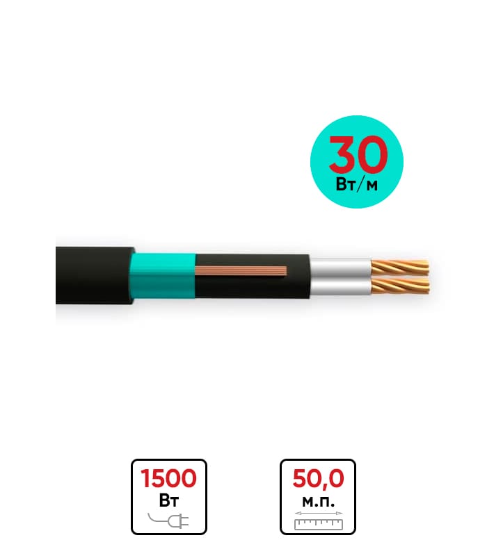 Источником тепла в системе SNK IS1500 служит двухжильный нагревательный кабель с линейной мощностью 30 Вт/п.м. Кабель состоит из двух нагревательных жил покрытых максимально надёжной и безопасной изоляцией из фторированного этилен-пропилена (FEP, ФЭП). Вторая внутренняя изоляция изготовлена из высококачественного сшитого полиэтилена (XLPE). Поверх изоляции располагается алюминиевая лента и медная заземляющая проволока. Внешняя оболочка кабеля их поливинилхлорида (ПВХ) черного цвета с защитой от ультрафиолета.