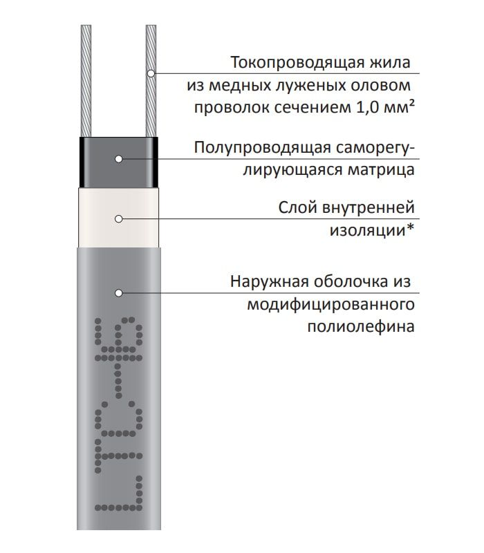 Саморегулирующийся нагревательный кабель Grand Meyer типа LTC16 SRL16-2 — это ленточный электрический нагреватель с параллельными проводниками. Полупроводящая саморегулирующаяся матрица наносится на лужёные оловом медные шины (1,0 мм²), состоящие из большого количества скрученных проволок. Тепловыделяющим элементом нагревательного кабеля является сама матрица, меняющая тепловыделение в зависимости от температуры окружающей среды.