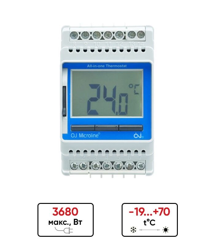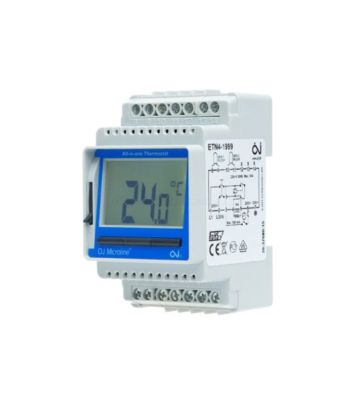 Термостат “Все в одном” OJ Microline ETN4-1999 с расширенным диапазоном регулируемой температуры используется для электрического обогрева пола, предотвращения замерзания, антиобледенения и снеготаяния, охлаждения. Простое управление и программирование.